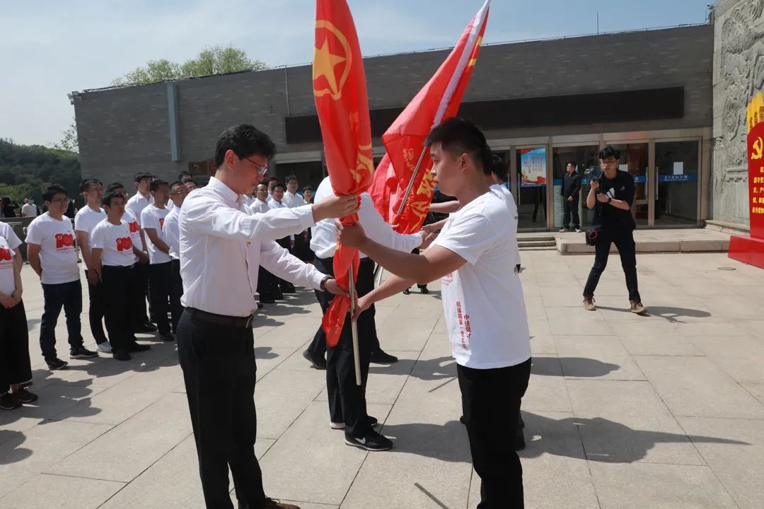 在詹天佑紀念館前,全體黨員干部凝視詹天佑雕像,重溫了入黨誓詞。我院王磊同志代表航遙院接過了平漯周新建鐵路項目的“青年突擊隊”旗幟,這面旗幟,代表的是光榮、責任與使命,需要全體航遙人團結一心、眾志成城,發揚孺子牛、拓荒牛以及老黃牛的“三牛”精神,不用揚鞭自奮蹄。