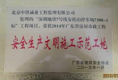 近日,中鐵誠業(yè)監(jiān)理公司深圳地鐵7號線項(xiàng)目部榮獲“2014年下半年廣東省建筑安全協(xié)會(huì)雙A級安全文明標(biāo)準(zhǔn)化工地和安全生產(chǎn)文明施工示范基地”榮譽(yù)稱號,受到廣東省建筑安全協(xié)會(huì)通報(bào)表彰。中鐵誠業(yè)監(jiān)理公司在深圳地鐵7號線7208標(biāo)中被深圳地鐵公司授予“優(yōu)勝單位”稱號,在7208監(jiān)理部內(nèi)張占彪榮獲“優(yōu)秀總監(jiān)理工程師”稱號,樊立魏、孟繁玉、李福建榮獲2014年深圳地鐵7號線“優(yōu)秀監(jiān)理工程師”稱號。
