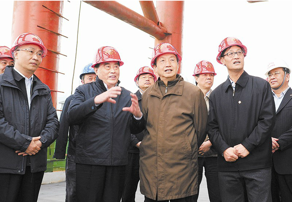 圖為馬凱在渝黔鐵路擴(kuò)能改造控制性工程白沙沱長江大橋施工現(xiàn)場了解建設(shè)情況。(李范軒/攝)