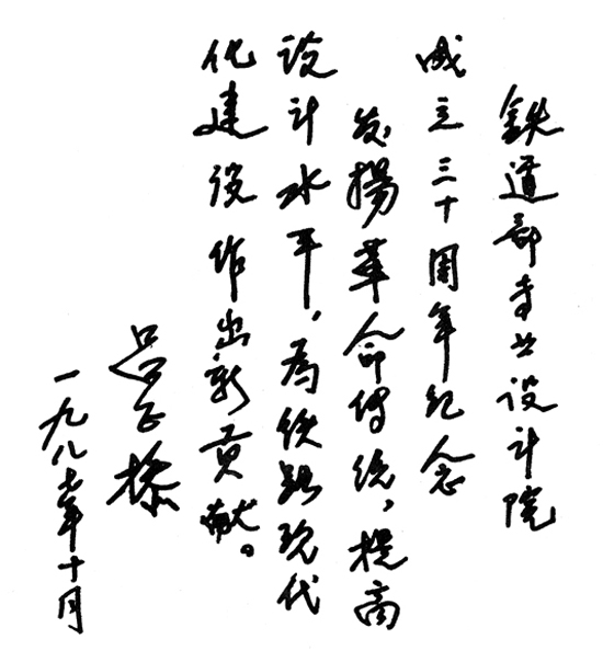 原全國政協(xié)副主席、鐵道部部長呂正操題詞(賀鐵道部專業(yè)設(shè)計院成立三十周年)