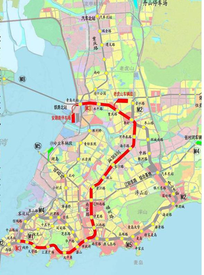 青島市地鐵一期工程(3號線)線路西起自市南區的青島火車站,向東沿廣西路、太平路、文登路、香港路,至五四廣場(市政府)拐入南京路向北,經江西路、寧夏路、遼陽西路,后進入哈爾濱路、黑龍江路、萬年泉路至李村,向西沿京口路、振華路至終點鐵路青島北站。青島市地鐵一期工程(3號線)總體呈“西-東-北-西”走向,途經市南區、市北區、四方區、李滄區,全長約24.779km,全部為地下線,設車站22座,其中換乘車站6座,分別與規劃1號、2號、4號、5號、8號線換乘。本線在北端的火車北站附近設安順車輛段和綜合基地一座。在河西站附近設控制中心一座。我公司承擔了全線的通信系統、綜合監控系統、車輛段的設計咨詢工作。目前,該工程已進行到各系統用戶需求書的咨詢階段。