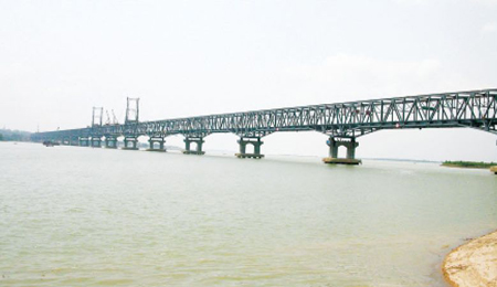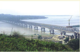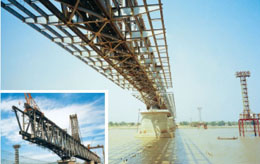 緬甸毛淡棉大橋-公鐵兩用大橋。該橋公路、鐵路在同一平面,主橋?yàn)?聯(lián)共21跨連續(xù)鋼桁梁,全長2345.6米,采用索塔懸臂拼裝法施工。